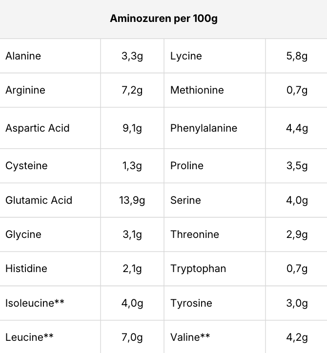 • Vollständiges Aminosäureprofil mit allen 9 essentiellen Aminosäuren (BCAAs)