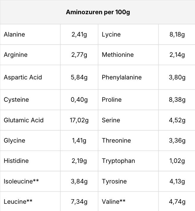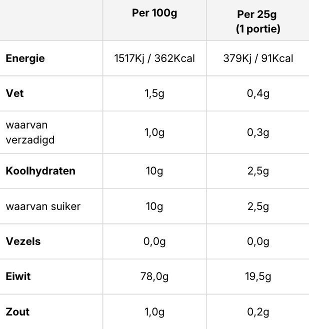 A standard serving of approx. 25 g provides around 20 g of protein, resulting in a protein content of about 78%.