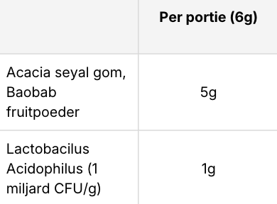 De samenstelling bestaat uit acaciavezels, baobab fruitpoeder en Lactobacillus acidophilus (1 miljard CFU per gram).